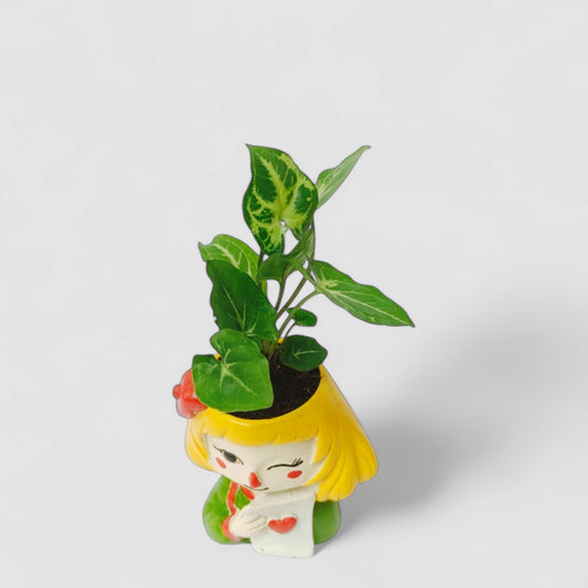 Cute Female Resin Doll Planter with Green Syngonium Plant - ONPD010