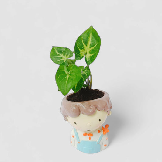 Cute Male Resin Doll Planter with Green Syngonium Plant - ONPD004