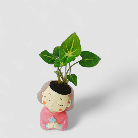 Cute Female Resin Doll Planter with Pink Syngonium Plant - ONPD002